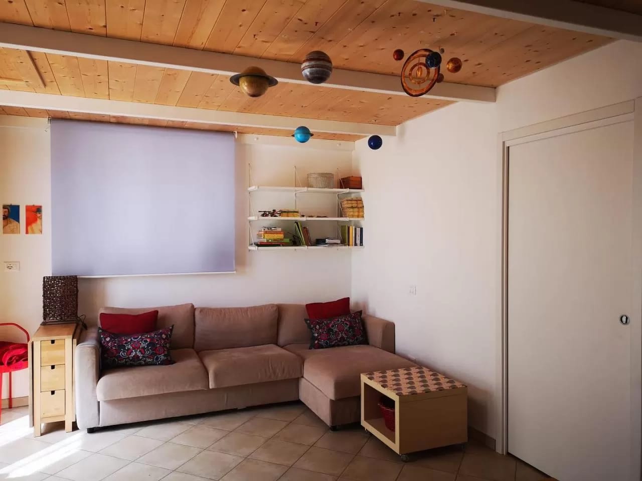 Porte e tende da interno. Porta scorrevole e tenda a rullo realizzati su misura. Colore bianco.